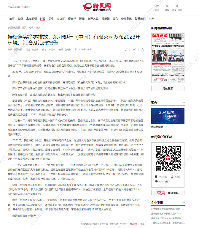 新民网:持续落实净零排放,东亚银行(中国)有限公司发布2023年环境、社会及治理报告