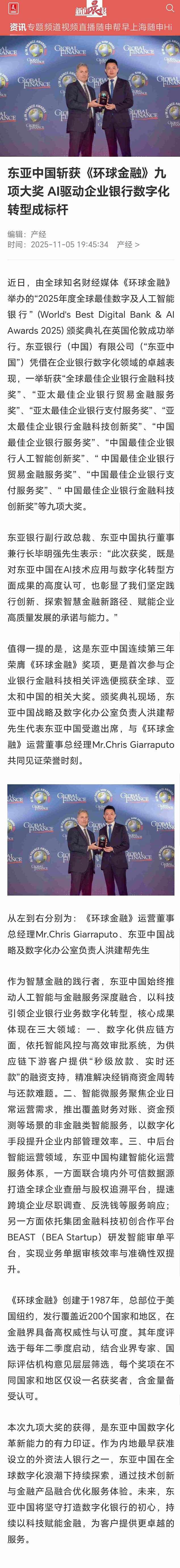 新闻晨报:东亚中国斩获《环球金融》九项大奖 AI驱动企业银行数字化转型成标杆