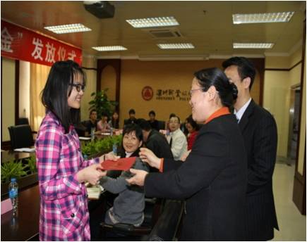 在发放仪式上,深职院学生处负责人首先介绍了东亚银行大学生助学金评选的情况,之后宣布了资助学生名单。冯华英副行长向 20 位受助学生发放了助学金资助证书。