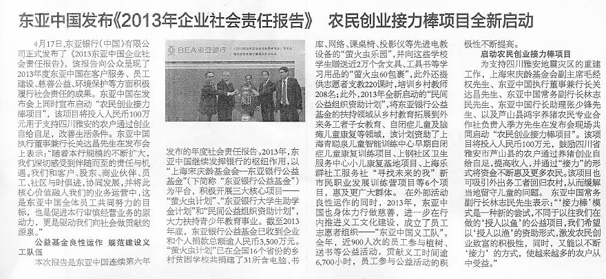 金融投资报:东亚中国发布《2013年企业社会责任报告》 农民创业接力棒项目全新启动