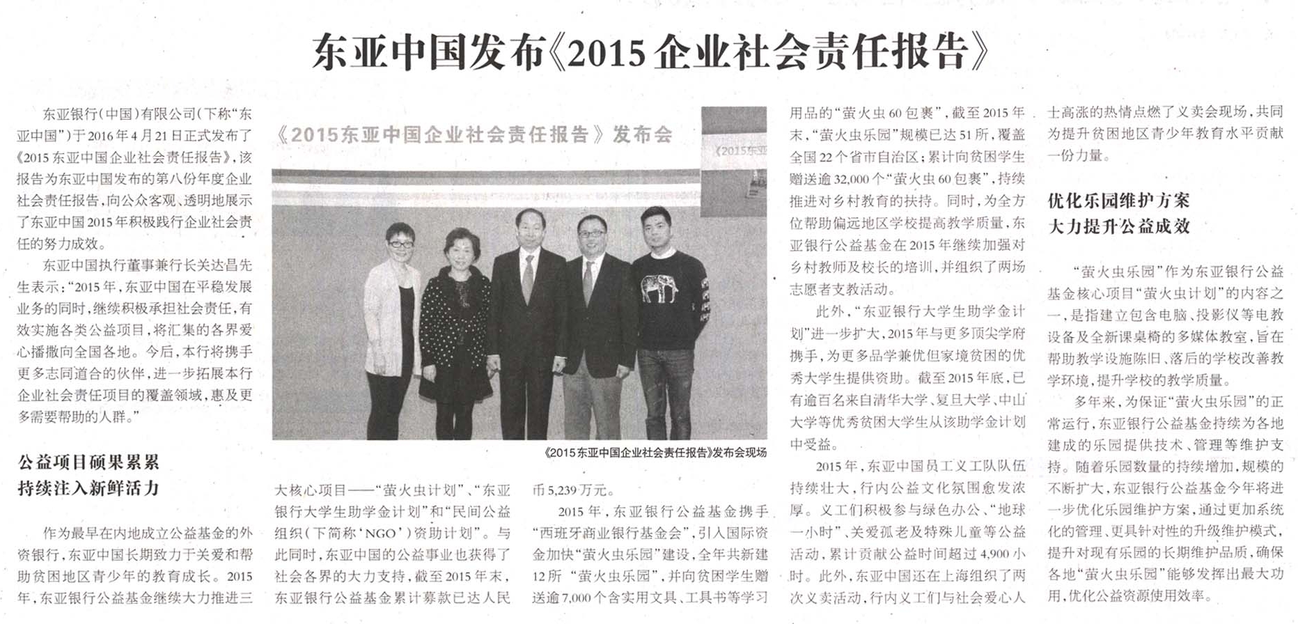 东亚中国发布《2015企业社会责任报告》