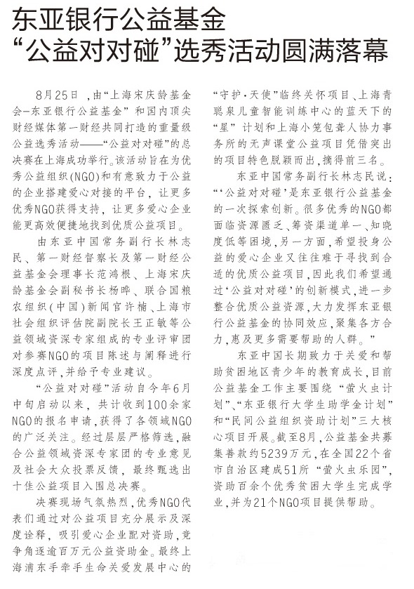 东方早报:东亚银行公益基金“公益对对碰”选秀活动圆满落幕