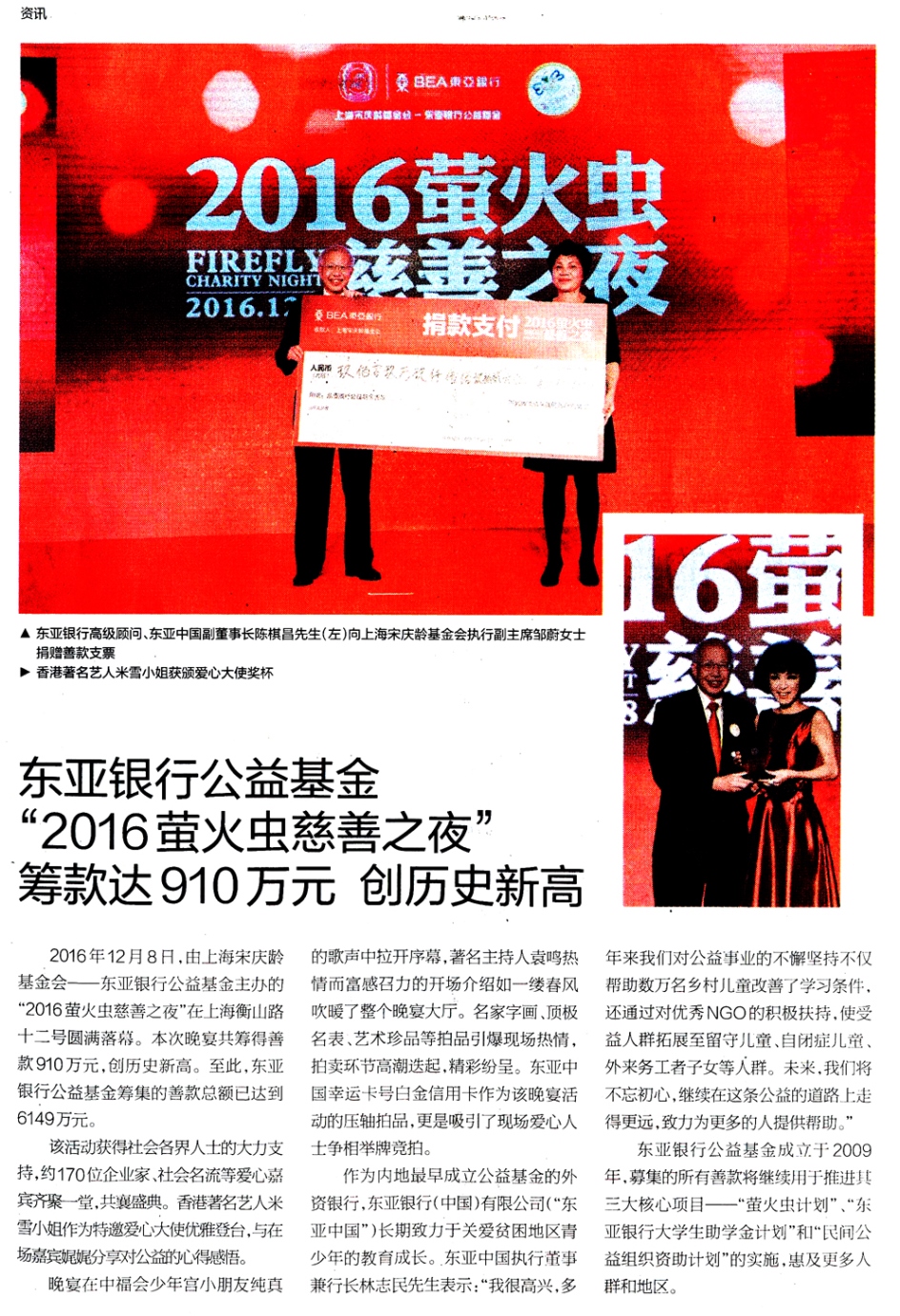 第一财经:东亚银行公益基金“2016萤火虫慈善之夜”筹款达910万元 创历史新高