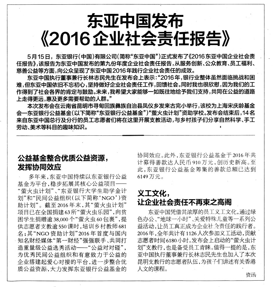 每日经济新闻:东亚中国发布《2016企业社会责任报告》