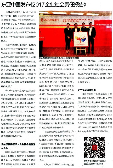 第一财经日报:东亚中国发布《2017企业社会责任报告》