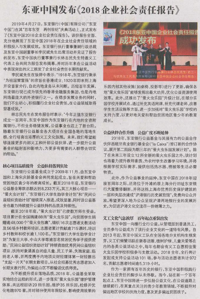 21世纪经济报道:东亚中国发布《2018企业社会责任报告》